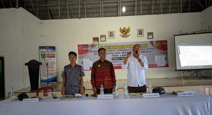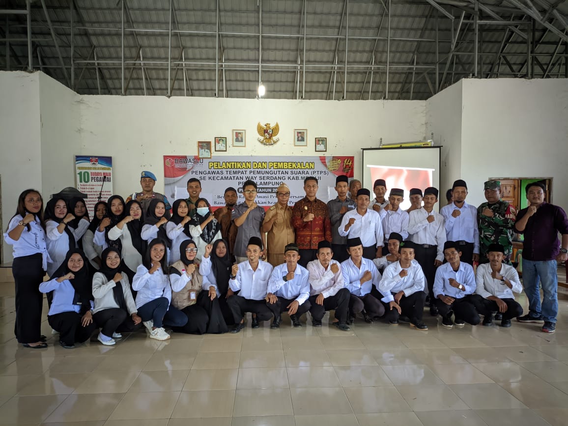 Panitia Pengawas Pemilihan Umum (Panwaslu) Kecamatan Way Serdang telah melaksanakan pelantikan dan Pembekalan sebanyak 134 Pengawas Tempat Pemungutan Suara (PTPS) dari 20 Kelurahan/Desa Kecamatan Way Serdang, Mesuji, Lampung pada Senin (22/01/2024).