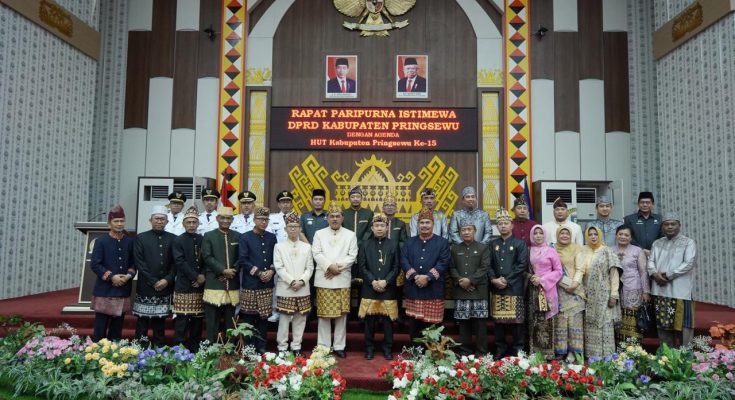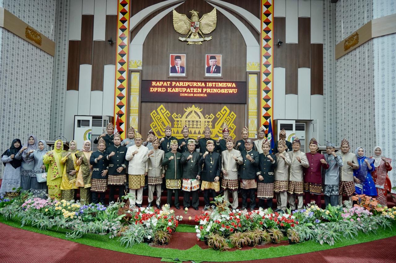 Rapat Paripurna Istimewa HUT ke-15 Kabupaten Pringsewu digelar di gedung DPRD Pringsewu, Komplek Perkantoran Pemkab Pringsewu, Pekon Klaten, Kecamatan Gadingrejo, Selasa (2/4/2024).