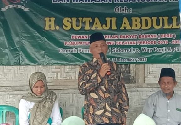 MNN.com, Lampung Selatan – Anggota Dewan Perwakilan Rakyat Daerah (DPRD) Kabupaten Lampung Selatan (Lamsel) dari Fraksi Partai Kebangkitan Bangsa (PKB) H.Sutaji Abdullah menggelar Sosialisasi Pembinaan Ideologi Pancasila dan Wawasan Kebangsaan (IPWK) di desa Bumi Restu Kecamatan Palas Kabupaten Lampung Selatan, Sabtu (9/2/2024).