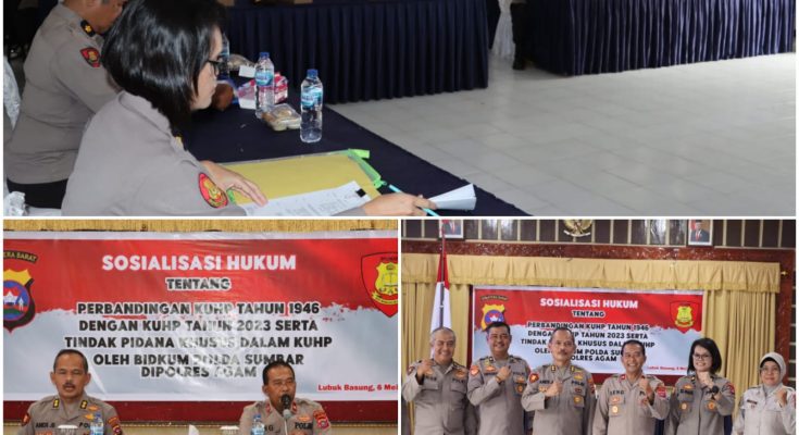 Kegiatan sosialisasi hukum tersebut digelar, bertujuan untuk meningkatkan kemampuan dan sumber daya personil Polres Agam tentang KUHP tahun 2023 yang akan diaplikasikan pada tahun 2026 nanti.