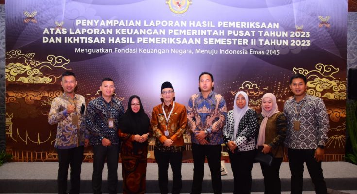 Penjabat Bupati Mesuji Febrizal Levi Sukmana, S.T., M.T., M.M. menyaksikan penyampaian Laporan Hasil Pemeriksaan (LHP) atas Laporan Keuangan Pemerintah Pusat (LKPP) tahun 2023 dan Ikhtisar Hasil Pemeriksaan Semester II tahun 2023 di Cendrawasih Room, Jakarta Convention Center (JCC), Senin (08/07/2024).
