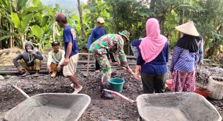 Boyolali,medianusantranews.com- Batiwanwil Koramil 13/Nogosari Kodim 0724/Boyolali Pelda Joko Wibowo bersama dengan warga masyarakat ikut serta dalam sebuah kegiatan karya bakti pengecoran jalan yang dilaksanakan di Dukuh Dilem Desa Pojok Kecamatan Nogosari Kabupaten Boyolali. Rabu (10/07/2024).
