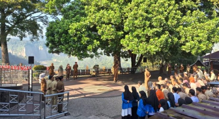 Dinas Pariwisata Kota Bukittinggi melaksanakan apel gabungan bersama seluruh jajarannya dengan tujuan mencari inovasi baru dan meningkatkan pendapatan. Kegiatan ini berlangsung di Taman Panorama Ngarai Sianok pada Senin (5/8/2024) pagi.