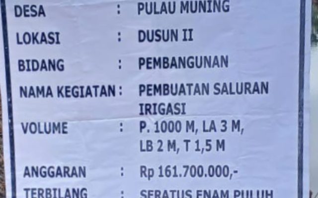 Pembangunan saluran irigasi tersebut, lanjut Kades, lokasinya di Dusun 2 yang dikerjakan oleh TPK Desa Pulau Muning Kecamatan Sembawa Banyuasin.