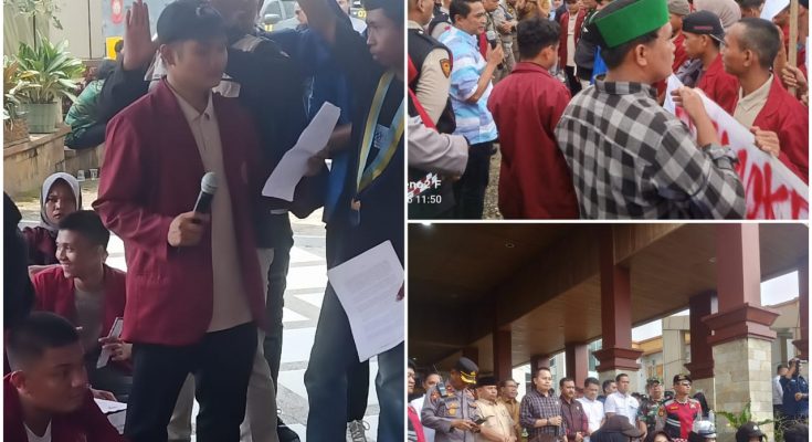 Ratusan mahasiswa yang tergabung dari Aliansi Mahasiswa Dharmasraya (AMD) menggelar demonstrasi di depan gedung DPRD Dharmasraya, Senin (26/8).