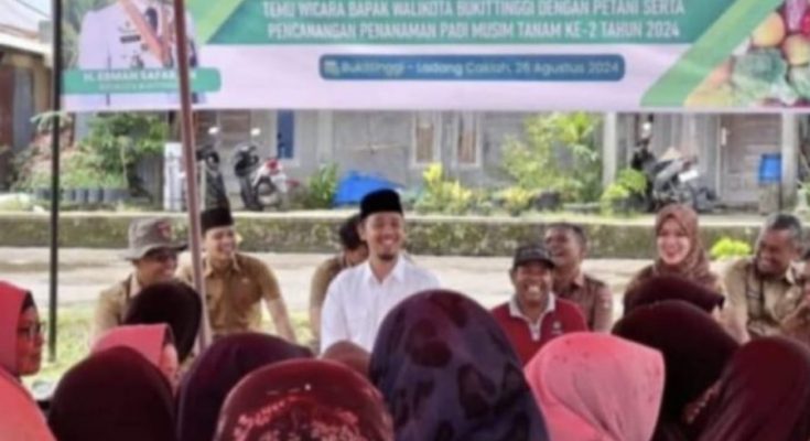Walikota Bukittinggi, Erman Safar, menghadiri acara temu wicara dengan kelompok tani sekaligus pencanangan penanaman padi untuk musim tanam kedua tahun 2024 yang berlangsung di areal persawahan Gapoktan Jaya Bersama, Kelurahan Ladang Cakiah, Kecamatan Aur Birugo Tigo Baleh (ABTB), Senin (26/8/2024).