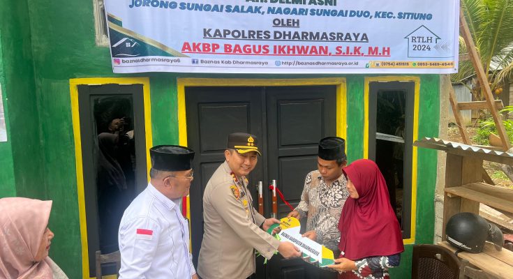 Kapolres Dharmasraya AKBP Bagus Ikhwan, SIK. MH, bersama Ketua Baznas Kabupaten Dharmasraya Z. Lubis, secara resmi menyerahkan kunci program Bedah Rumah Tidak Layak Huni (BRTLH) kepada Delmi Asni, warga Jorong Sungai Salak, Nagari Sungai Duo, Kecamatan Sitiung, Kabupaten Dharmasraya.Pada Selasa, 24 September 2024, pukul 10.00 WIB, Penyerahan ini adalah bagian dari program sosial yang dilakukan atas kolaborasi Polres Dharmasraya dengan Baznas setempat, bertujuan untuk memberikan tempat tinggal yang layak bagi warga yang membutuhkan.