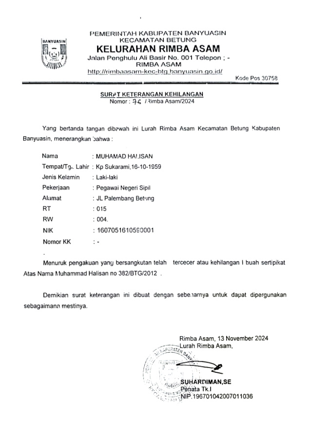 “Sudah saya berusaha mencari ditempat penyimpanan semua berkas penting pun masih tidak diketemukan, maka hari ini saya langsung buat laporan kehilangan di Kantor Lurah Rimba Asam”, jelasnya.
