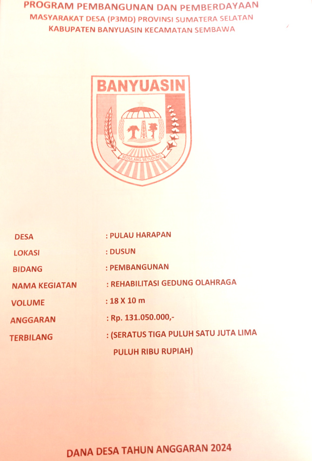 Banyuasin,medianusantaranews.com- Melalui anggaran Dana Desa (DD) 2024 Pemerintah Desa (Pemdes) Pulau Harapan Kecamatan Sembawa Kabupaten Banyuasin Provinsi Sumatera Selatan melakukan rehab Gedung olah raga.