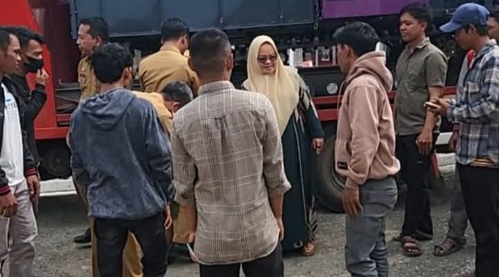 Bupati terpilih Elfianah Khamami bersama Pelaksana Tugas (PLT) Sekretaris Pertanian Darul B melakukan penyerahan bantuan Combine Harvester kepada Brigade Pangan Desa Sungai Badak Kecamatan Mesuji, Selasa, 11 Februari 2025.