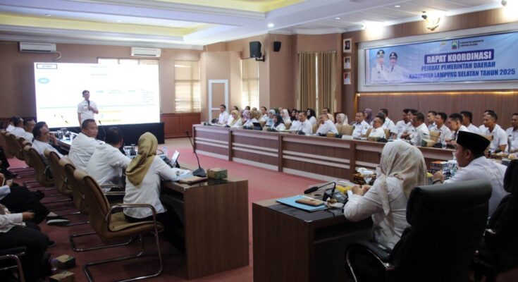 MNN.com, Kalianda – Pemerintah Kabupaten (Pemkab) Lampung Selatan menggelar rapat koordinasi bulanan di Aula Krakatau, kantor bupati setempat, Rabu (10/9/2025). Rapat yang biasanya hanya diikuti pejabat eselon II kali ini digelar dalam dua sesi, dengan melibatkan hingga pejabat eselon IV yang membidangi perencanaan.