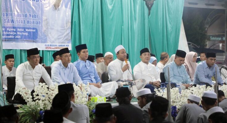 Ribuan jemaah tumpah ruah mengikuti peringatan Maulid Nabi Muhammad SAW 1447 Hijriah yang dikemas dalam kegiatan SHOBAT (Sholawat Bareng Bupati) bersama Bupati dan Wakil Lampung Selatan, Radityo Egi Pratama-Syaiful Anwar BBM b . m itu.
